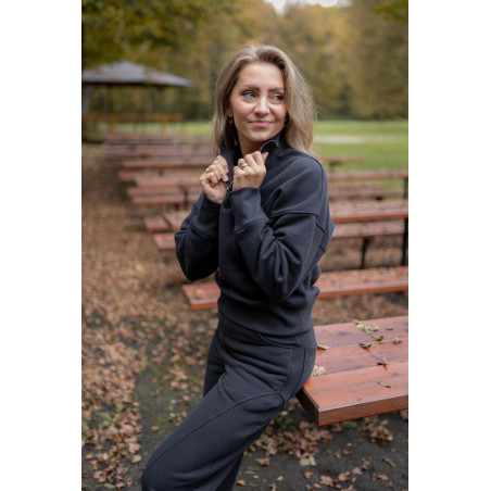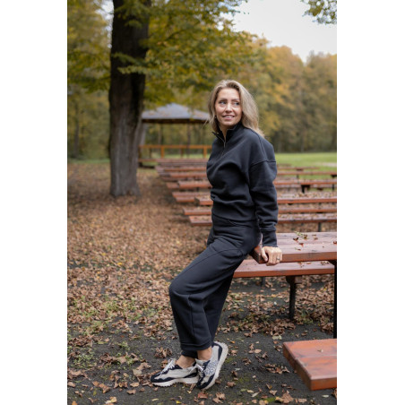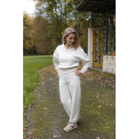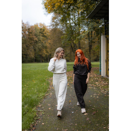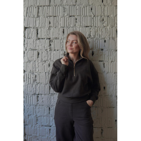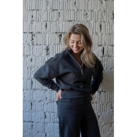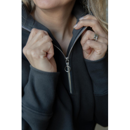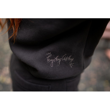 Má stojáček s kovovým ozdobným zipem s očkem, který funguje jako jemný šperkový prvek. Dolní lem i manžety rukávů jsou ze žebroviny, díky které mikina drží tvar a pohodlně se nosí. Na zadním díle, v dolní části, je umístěna jemná výšivka Kyšky Lišky jako nenápadný podpis značky.
