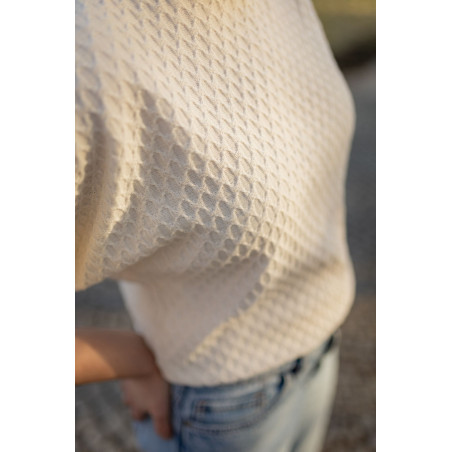 Minimalistická halenka z měkké žakárové pleteniny, která zaujme jemnou strukturou a neuvěřitelně příjemným omakem.