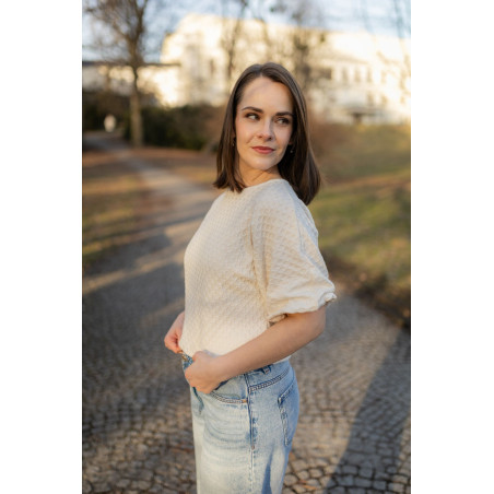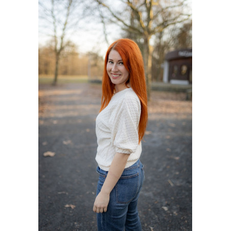 Žakárová halenka Vilma spojuje minimalistický střih s mimořádně příjemným materiálem. Je ušitá z jemné bavlněné pleteniny s plastickou žakárovou strukturou v pravidelných oválných tvarech, která dodává látce přirozenou hloubku a zajímavost.